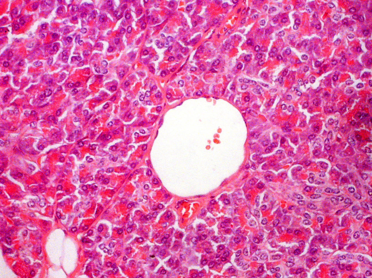 A fat cell has a single nucleus placed eccentrically in the cell. No other nuclei are visible. No intimal layer is visible around the fat globule that comprises the bulk of the cell. Fat cells border each other or are directly in contact with surrounding tissues without the layers seen in blood vessels.