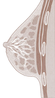 Borskaswand / Chest wall M pectoralis / Pectoralis muscles Lobuli / Lobules Oppervlak van tepel / Nipple surface Areola / Areola Afvoerbuis van melkklier / Lactiferous duct Vetweefsel / Fatty tissue Vel / Skin