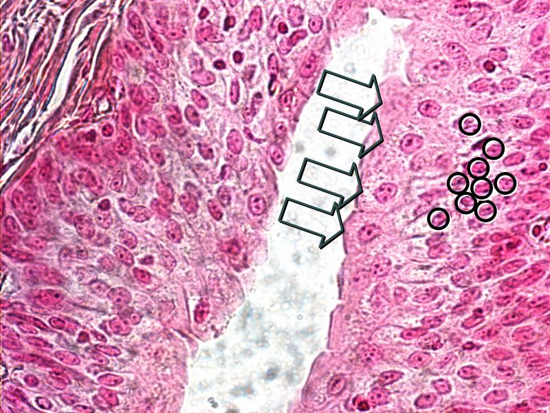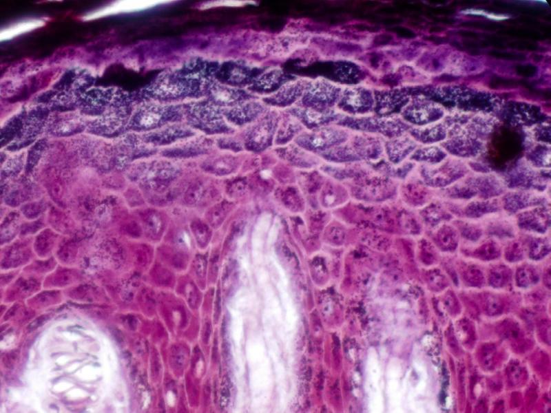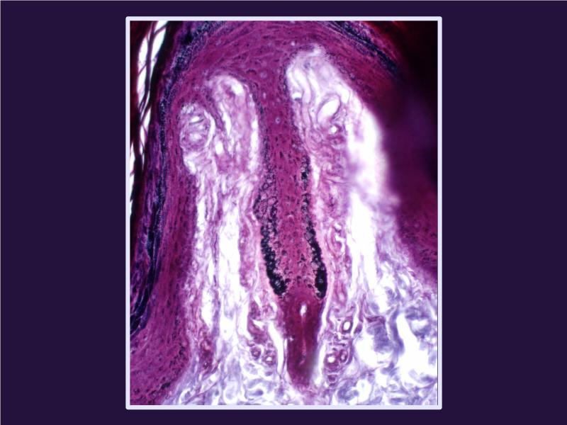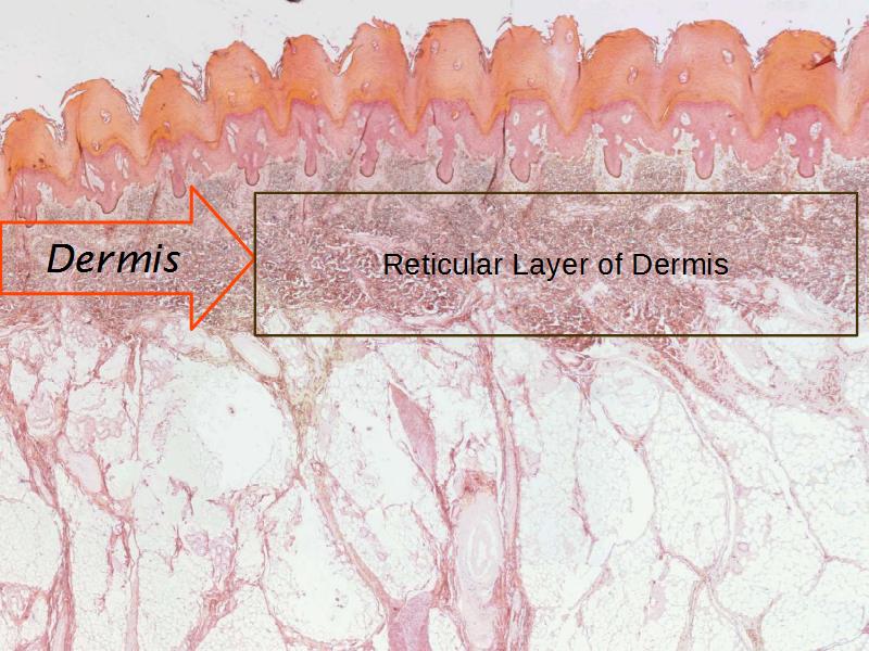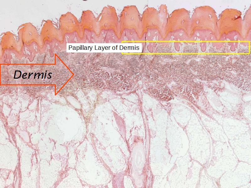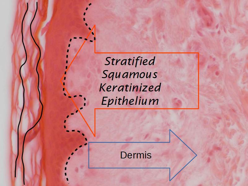 - A central light pink eosinophilic area - the dermis.