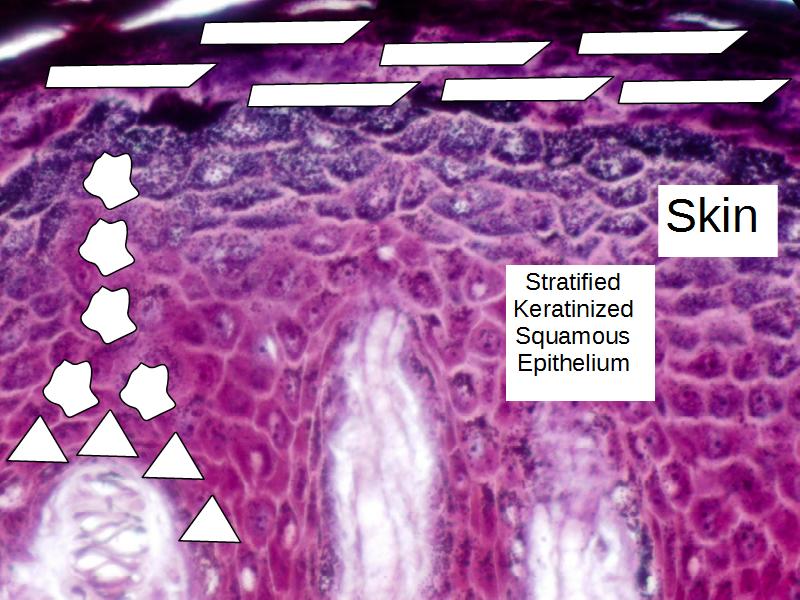 - Look at the palm of your hand and fingertips. The thickened outer layer is the outer layer of stratified squamous keratinized epithelium.