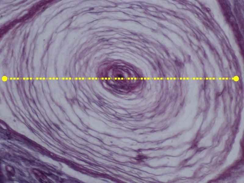 View the slides at low magnification. You should be able to see several layers, stained different colours and intensities. For a standard haematoxillin and eosin stained slide, there are three layers: